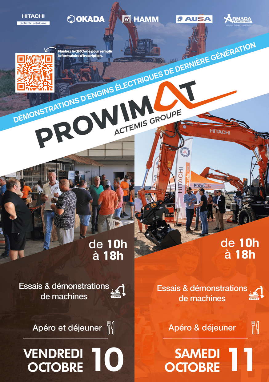 Venez découvrir notre large gamme de machines Hitachi, AUSA, Manitou, Okada et Hamm, assistez à des démonstrations en direct et testez des modèles exclusifs. Profitez d’un moment convivial en compagnie de nos équipes autour d’un repas et d’un apéritif. Un rendez-vous incontournable à ne pas manquer chez Prowimat !